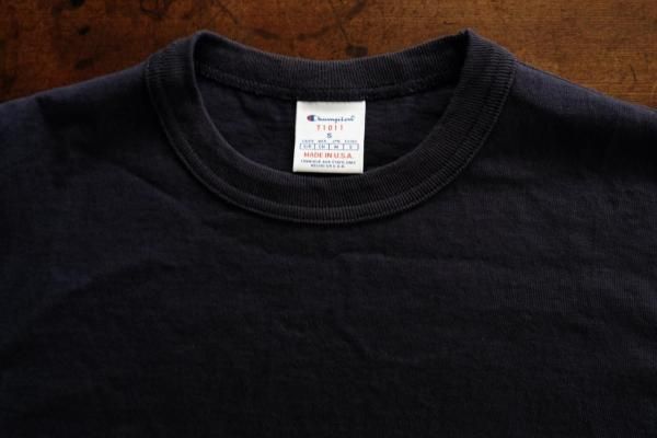 Champion Short Sleeve T-shirts "T1011"。何と言っても特徴的なのはその素材感!ですが、細かなデザインや仕様も魅力的です。両サイドに繋ぎ目がない丸胴仕様になっており、着たときのストレスがなく、なおかつとっても丈夫になっています。また、ヴィンテージTシャツに特徴的なバインダーネックを採用。帯状の襟パーツを見頃に包み込むように縫製することで、強度が増しています。愛用する度に、お洗濯を繰り返す度に味わいが増していく。T1011はそんなTシャツ。きっとあなたの相棒の様な存在になることでしょう。
