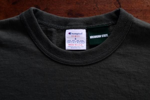 Champion Short Sleeve T-shirts "T1011"。何と言っても特徴的なのはその素材感!ですが、細かなデザインや仕様も魅力的です。両サイドに繋ぎ目がない丸胴仕様になっており、着たときのストレスがなく、なおかつとっても丈夫になっています。また、ヴィンテージTシャツに特徴的なバインダーネックを採用。帯状の襟パーツを見頃に包み込むように縫製することで、強度が増しています。愛用する度に、お洗濯を繰り返す度に味わいが増していく。T1011はそんなTシャツ。きっとあなたの相棒の様な存在になることでしょう。