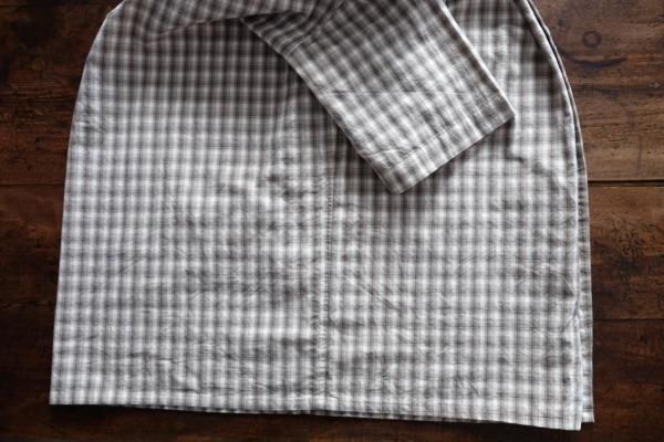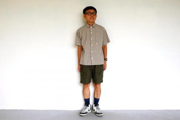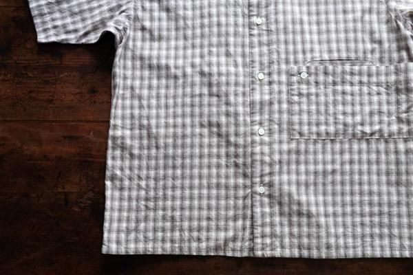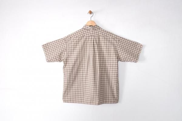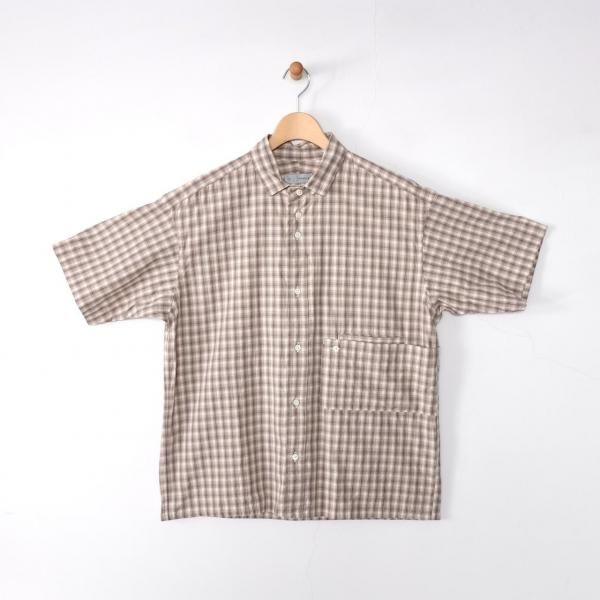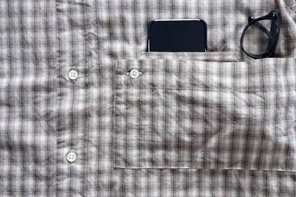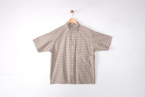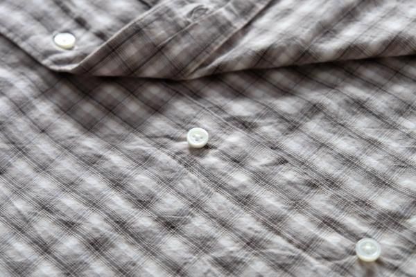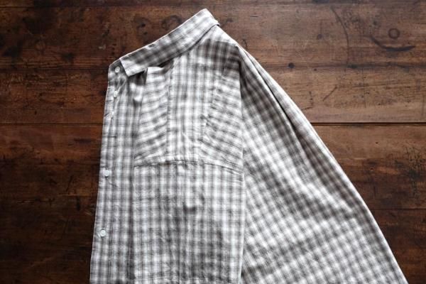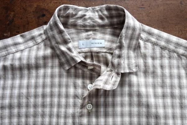nisicaのregular collar shirtsはゆったりシルエットのややアウター的要素のシャツ。身幅、肩幅、着丈共に気持ち大きめサイズになっています。襟はワイド気味な小さめのレギュラーカラー。首元にボタンが3つ。その下にから前立てがはじまり、ボタンが4つ連なります。nisicaのロングセラーアイテム・button down shirtsの流れを受け継いだような雰囲気が感じられます。ちなみにボタンはすべて上質な本貝ボタンです。このシャツの一番のポイントは左胸下部に付いた2つの異なるポケット。内側はインポケット、外側はボタン付きのパッチポケット。絶妙にズラして付けてあるので、インポケットがチラッと見えるようになっています。また外側のパッチポケットが珍しく横広で、けっこう収納力があります。長財布が入っちゃうかも知れませんね。使っている生地は、とっても渋い配色のコットンチェック。グレーとカーキを組み合わせたようなチェック柄で、とっても魅力的。コーディネートもしやすそうです。お若い方からご年配の方まで、幅広い年代の顧客様にご愛用いただけることと思います。贈りものにも喜ばれそうですね!是非ご検討ください。