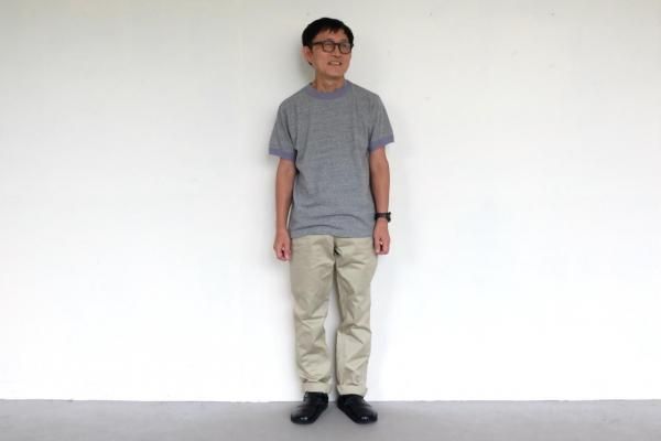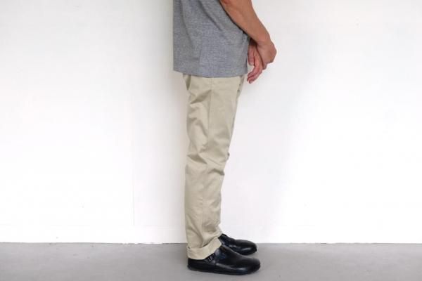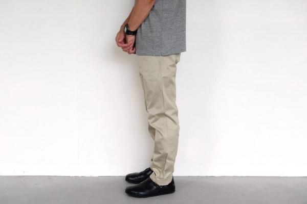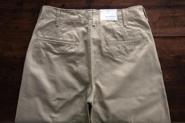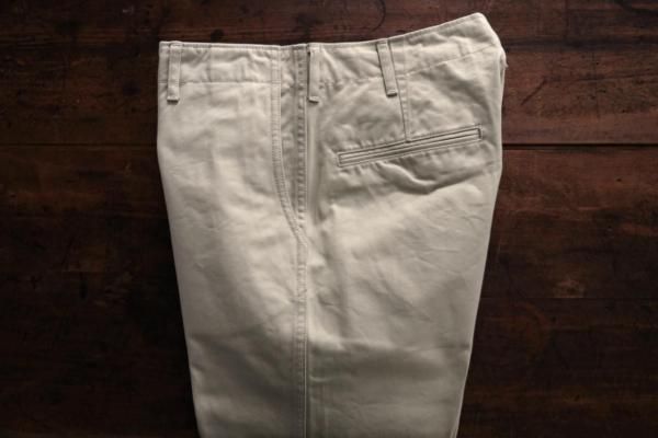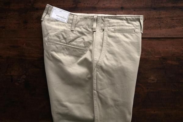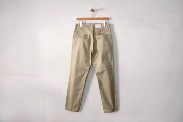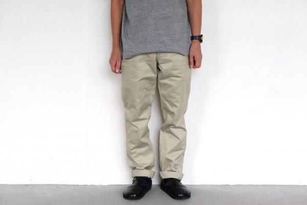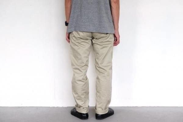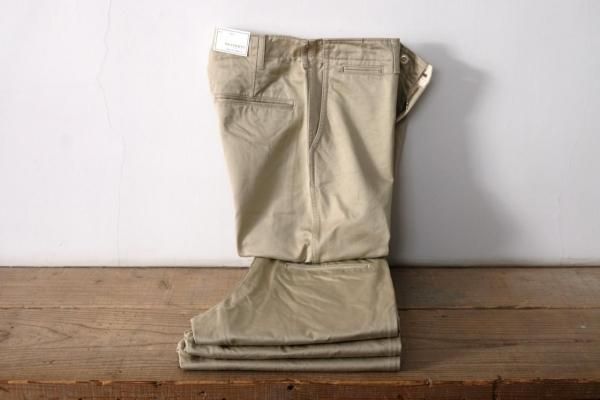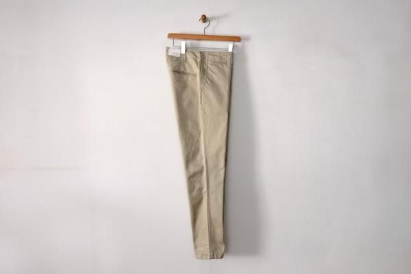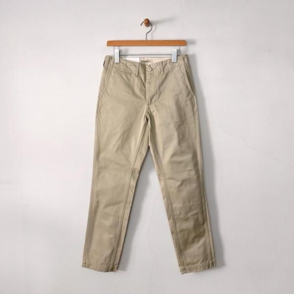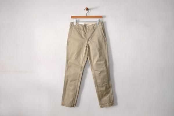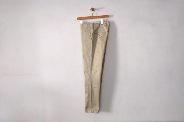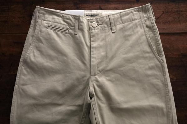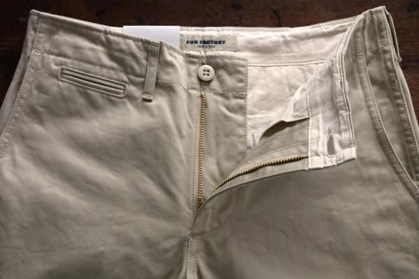FOB FACTORY Narrow U.S Trouserは、FOB Factoryオリジナルの生地で仕立てたチノパンツです。綿糸を限界まで多く打ち込んで織り上げた高密度のヘビーウェポン。糸に双糸を用いているので、しなやかさを併せ持った生地になっています。このようなウェポンは、ほかには存在しません。U.S. ARMYのチノパンツをベースにしてデザイン。玉縁ポケットや巻き縫いなど大まかな仕様は再現しつつも、シルエットについてはFOB FACTORYらしく細めのきれいなシルエットに仕立てています。コーディネートする服を選ばない、流行に左右されない、長くご愛用いただけるチノパンツです。着込むほどに現れる上品で細かなアタリも楽しんでいただきたい。