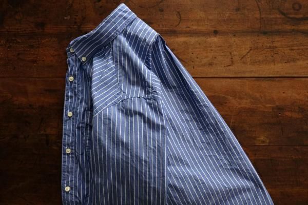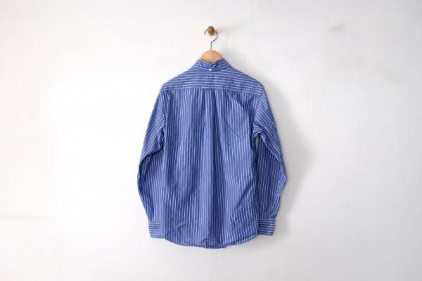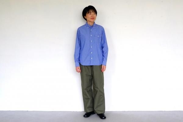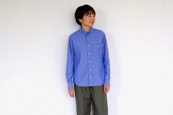 typewriter stripeは僕が思い焦がれた生地。これまで2回 h.b shirtsを作ってきましたが、数年のあいだ生地が廃番となっていました。今回、ようやく復活したことを知り、迷うことなくセレクトしました。こちらも、人と自然を大切に考えて育てられたオーガニックコットンを100%使用して作られたコードットオーガニックスのコットン素材。やや薄手の先染めローン素材にクラフトワッシャー(1反ずつ加工をし、クラフト感と手づくり感ある表情に仕上げる加工)を施し、ヴィンテージライクな凹凸感とリラックス感漂う天日干しの風合いに仕上がっています。細番手のコットン糸で高密度に織られたタイプライター素材。薄くて軽くて適度な張りがあります。サラッとした着心地。ほぼオールシーズンご愛用いただくことができます。ブルーベースにホワイトのストライプ柄はとっても爽やかで上品。着ているだけで気持ちの良い1日を過ごせそうです。これまでずっと我慢をしてきましたが、今回こそ自分もゲットしたいな。
