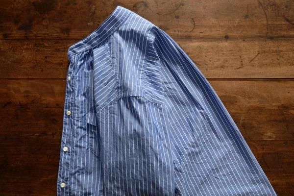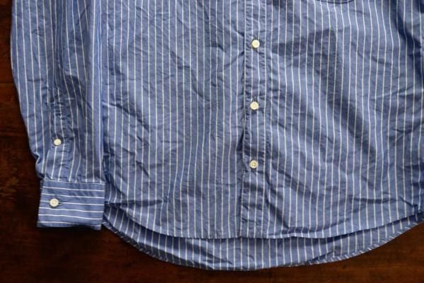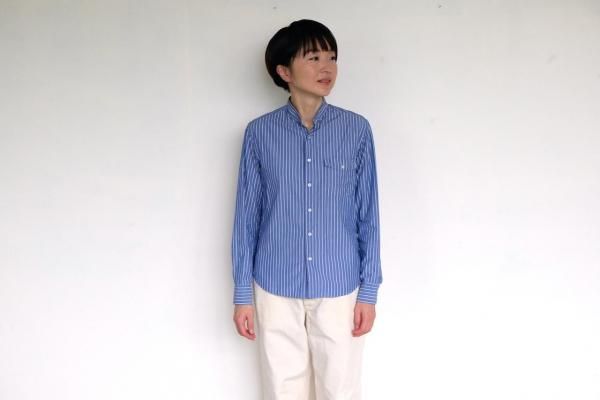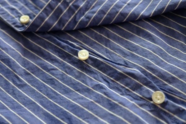 typewriter stripeは僕が思い焦がれた生地。これまで2回 h.b shirtsを作ってきましたが、数年のあいだ生地が廃番となっていました。今回、ようやく復活したことを知り、迷うことなくセレクトしました。こちらも、人と自然を大切に考えて育てられたオーガニックコットンを100%使用して作られたコードットオーガニックスのコットン素材。やや薄手の先染めローン素材にクラフトワッシャー(1反ずつ加工をし、クラフト感と手づくり感ある表情に仕上げる加工)を施し、ヴィンテージライクな凹凸感とリラックス感漂う天日干しの風合いに仕上がっています。細番手のコットン糸で高密度に織られたタイプライター素材。薄くて軽くて適度な張りがあります。サラッとした着心地。ほぼオールシーズンご愛用いただくことができます。ブルーベースにホワイトのストライプ柄はとっても爽やかで上品。着ているだけで気持ちの良い1日を過ごせそうです。これまでずっと我慢をしてきましたが、今回こそ自分もゲットしたいな。