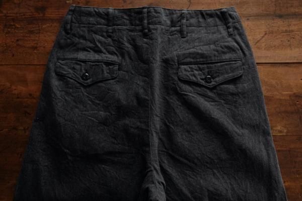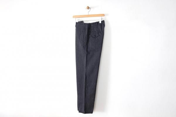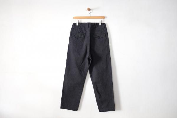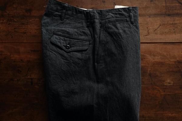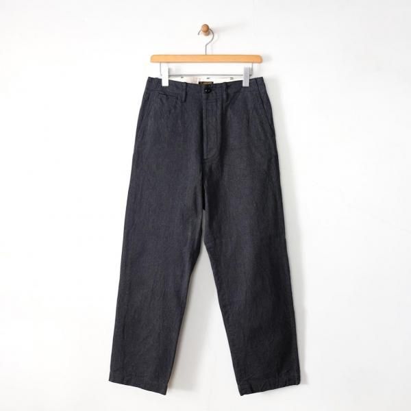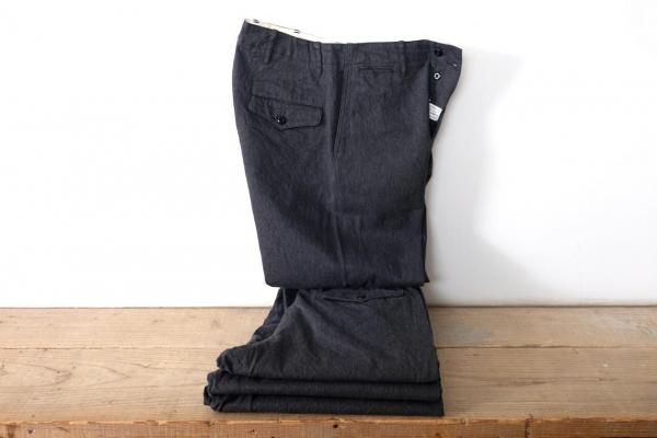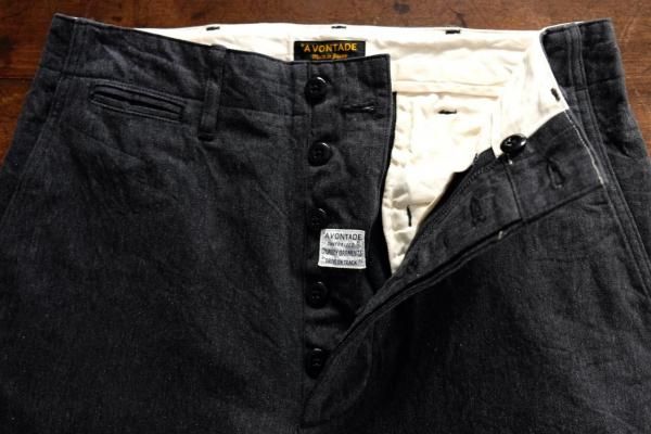 *A VONTADE Type 45 Chino Trousersは、通称「45カーキ」と呼ばれる1945年のアメリカ軍のチノパンツをベースにしてデザインされたシンプルなパンツ。45カーキを意識した直線的なワイドシルエットですが、革靴やスニーカーにも合わせやすいように膝から裾にかけてテーパードを加えています。後ろポケットはフラップ付きにアレンジ。ベルトループ上部は腰ベルトに流し込む仕様にしています。巻き縫いは使用せず、尻くいや脇、内股はすべて割り始末にて縫製しています。素材は経糸にトップ糸、緯糸に黒を打ち込んだコットンツイルを使用しています。生地、シルエット共にとっても大人っぽいパンツです。カッコいいですよ。是非お試しください。